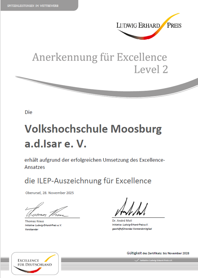Wir sind in Moosburg eine anerkannte Einrichtung der Erwachsenenbildung und stehen für ein breites Bildungsangebot von hoher Qualität. Damit wir den hohen Qualitätsanspruch auch in Zukunft sicherstellen, den auch die kommunalen Spitzenverbände in einer gemeinsamen Erklärung mit dem Bayerischen Volkshochschulverband für ihre öffentlichen Bildungseinrichtungen fordern, haben wir das Qualitätsmanagement nach dem international anerkannten Excellence-Modell der European Foundation for Quality Management (EFQM) eingeführt. Dabei werden Qualitätsstandards zugrunde gelegt und Verfahren eingesetzt, die auf eine systematische und kontinuierliche Verbesserung des Angebots und der Organisation zielen.